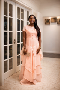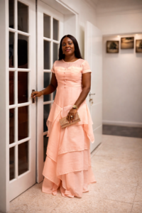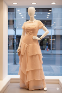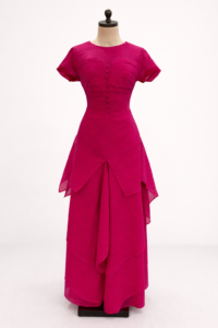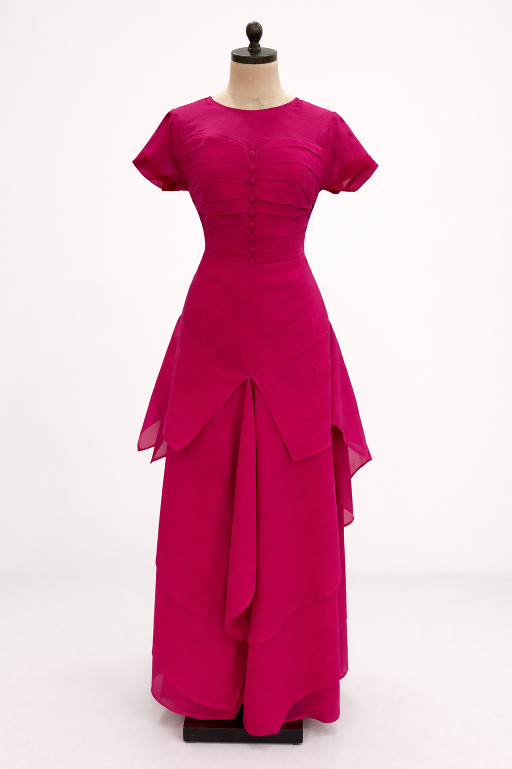 A soft, airy and elegant floor-length evening dress has a romantic and feminine style. The bodice is delicately pleated to the waistline and flowing down to a multiple layered asymmetrical bottom. it is made with the soft and rich organza fabric. The uneven layers give this masterpiece a modern and slightly whimsical touch